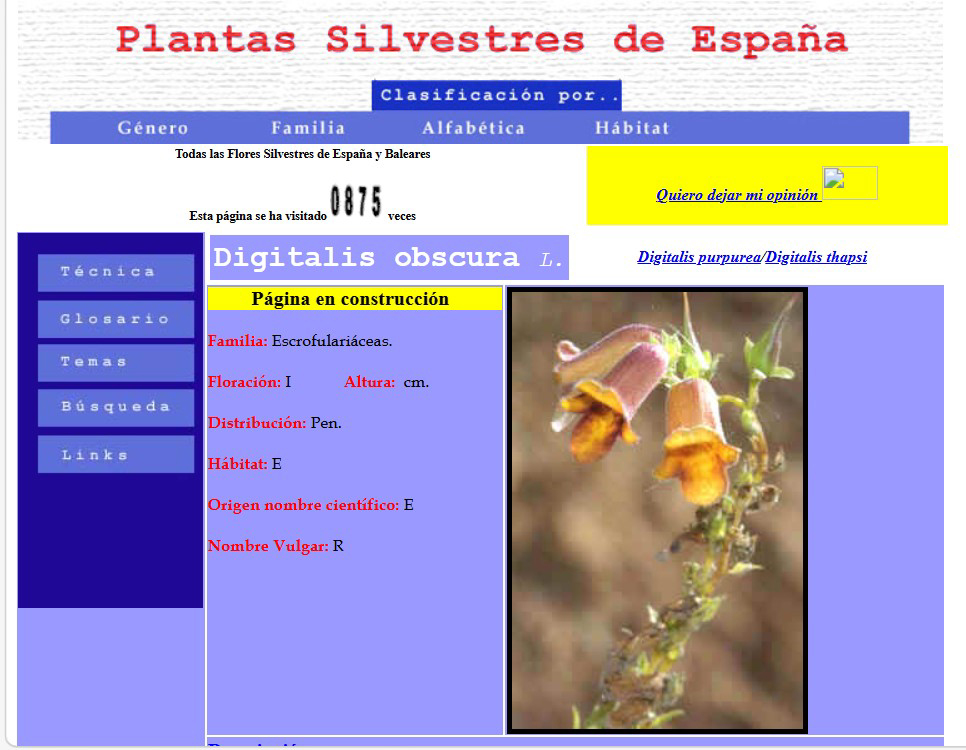 25 Años de trabajo intentando ser una web de referencia para el aficionado sobre las Plantas Silvestres de España. De ser la primera y única web en internet en aquel 2001 de esta temática de España, se pasó a existir otras muchas webs dedicadas a este mundo apasionante de las flores silvestres.