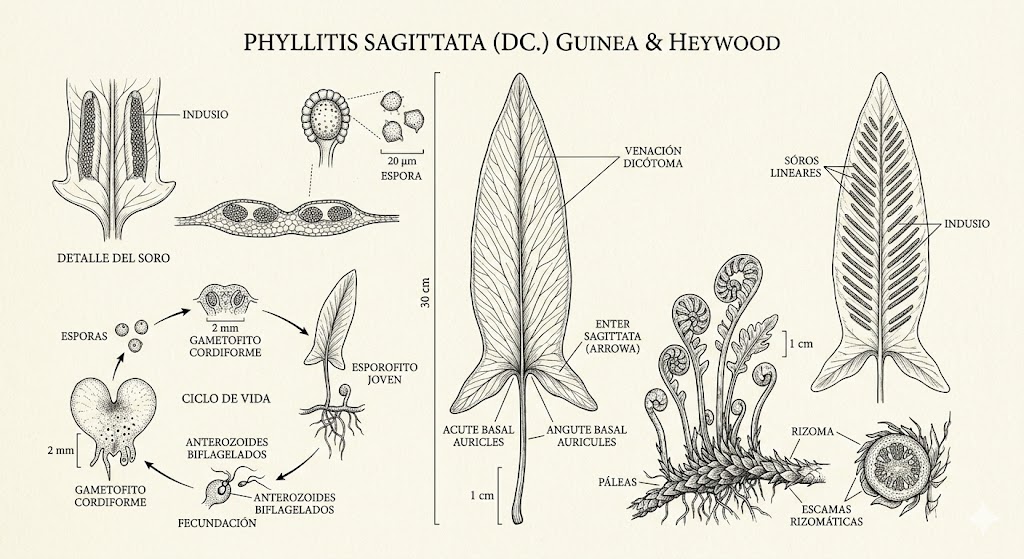 A diferencia de otros helechos más sensibles, la Phyllitis sagittata tiene una fronde (hoja) algo más coriácea (dura y de tacto similar al cuero). Esta cutícula gruesa le ayuda a: