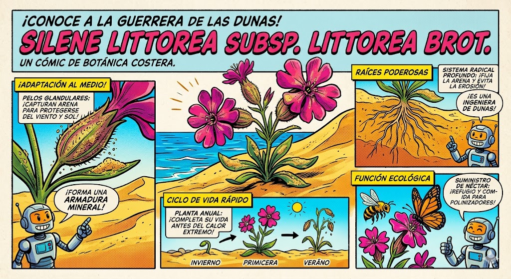 Cuando ves a la Silene littorea directamente en la playa, es donde realmente entiendes por qué es una superviviente nata. En ese entorno, la planta no solo «está», sino que desempeña un papel ecológico crucial.