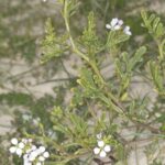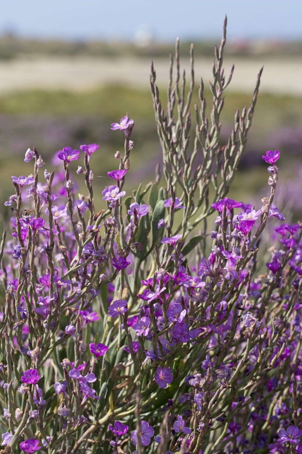 Oruga de Mar (Cakile maritima): De hojas carnosas y flores lilas, suele estar muy cerca de la orilla, resistiendo el impacto directo del spray marino.