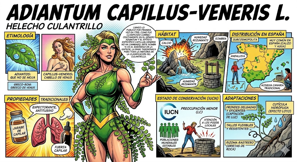 Etimología de la Especie: capillus-veneris= del latí­n capillus,-i m. =cabello o cabellera; y de venus,-eris f.=Venus; cabellera de Venus, por la forma tendida que tienen los frondes que simulan cabellos caídos.