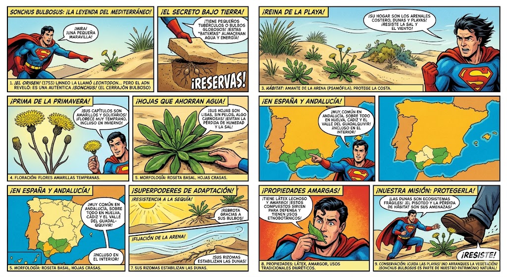 Para sobrevivir en entornos tan hostiles como los arenales costeros y los climas mediterráneos secos, Sonchus bulbosus ha desarrollado un conjunto de adaptaciones biológicas fascinantes. Estas estrategias le permiten manejar la escasez de agua, la movilidad del suelo y el pastoreo.
