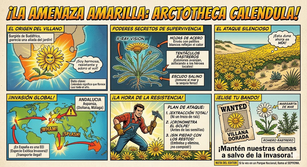 La Arctotheca calendula no es solo una planta que crece fuera de su sitio; es una especie exótica invasora (EEI) con un impacto ecológico significativo, especialmente en la Península Ibérica.