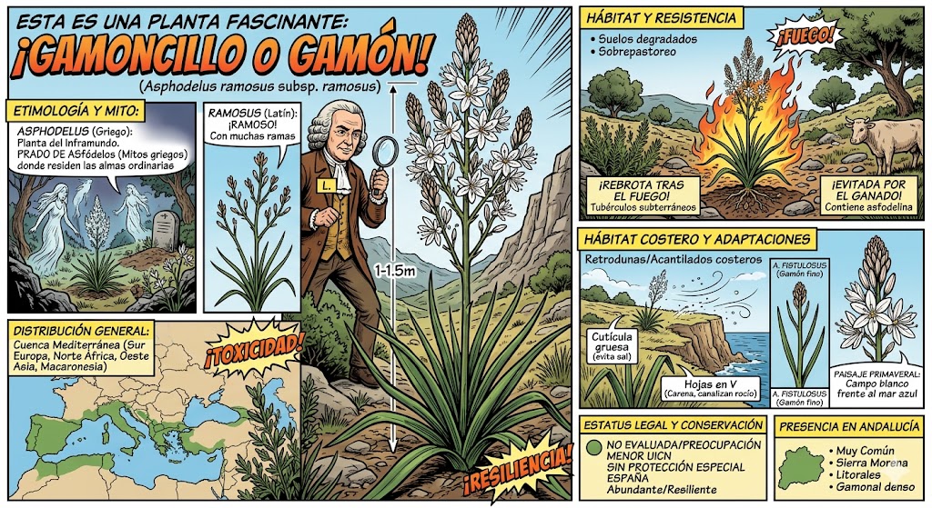 Esta es una planta fascinante, conocida comúnmente como Gamoncillo o Gamón. Es una de esas especies que definen el paisaje del Mediterráneo, especialmente cuando florece en primavera.