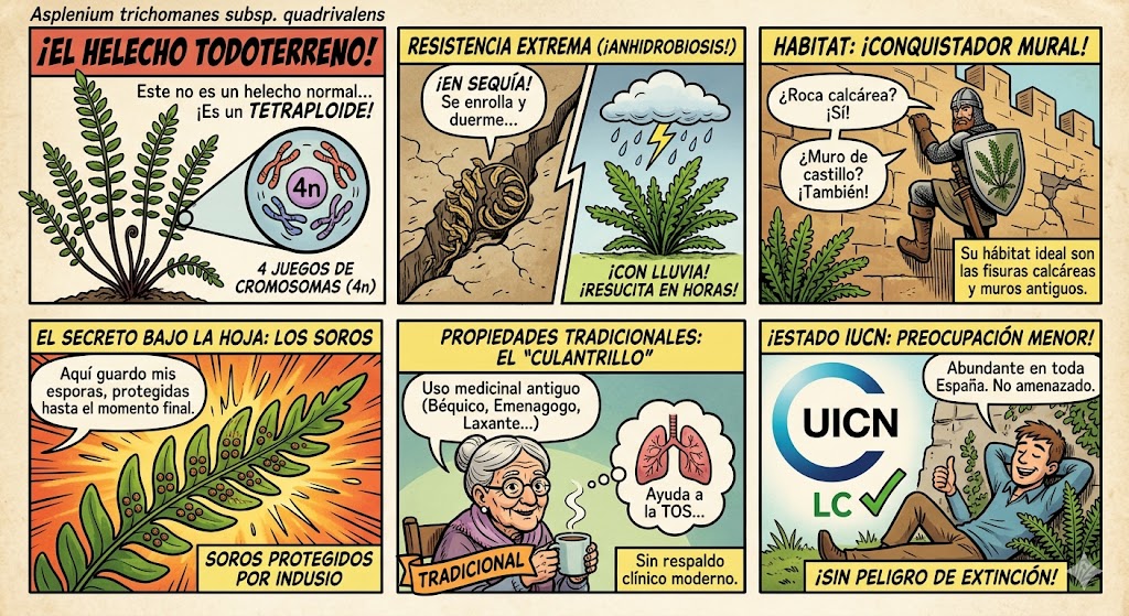 Su hábitat no es solo la roca natural; su capacidad para saltar a las construcciones humanas le ha permitido expandirse por toda la geografía española, incluso en zonas urbanas donde otros helechos no sobrevivirían.