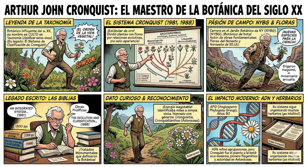 Arthur John Cronquist fue uno de los botánicos más influyentes del siglo XX. Si te interesa la taxonomía (la ciencia de clasificar a los seres vivos), Cronquist es básicamente un nombre de culto. Su mayor legado es el Sistema de Clasificación de Cronquist, que fue el estándar de oro para organizar las plantas con flores (angiospermas) durante décadas.