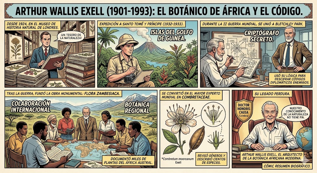 Además de su labor científica, Arthur Wallis Exell sirvió durante la Segunda Guerra Mundial en el centro de criptografía de Bletchley Park, donde trabajó en la sección dedicada a descifrar códigos diplomáticos, demostrando una mente analítica excepcional que iba más allá del estudio de las plantas.