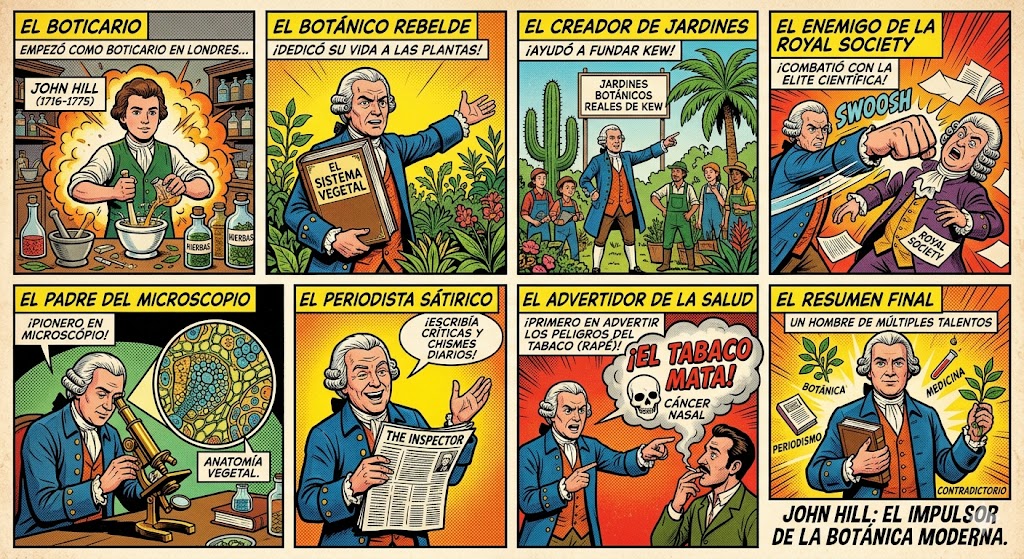 La importancia de Sir John Hill (1716-1775) radica en que fue una figura de transición crítica entre la botánica antigua (basada en el uso medicinal de las hierbas) y la botánica moderna (basada en la taxonomía y la observación microscópica).