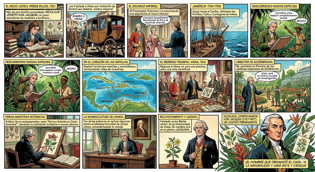 Nicolaus Joseph von Jacquin fue responsable de identificar y describir cientos de especies nuevas para la ciencia europea del siglo XVIII, especialmente tras su expedición al Caribe. Su trabajo fue tan exhaustivo que muchas de estas plantas conservan hoy el nombre que él les asignó.