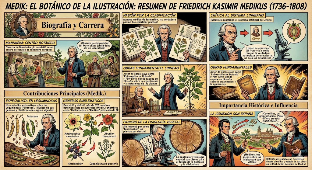 En resumen, Medikus es importante porque no solo descubrió plantas nuevas, sino que enseñó a los botánicos a mirar las plantas de una manera más profunda y detallada.