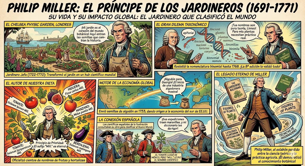 La importancia de Miller radica en que fue el eslabón perdido entre la ciencia teórica y la práctica agrícola. Sin él, la transición de la botánica antigua a la moderna hubiera sido mucho más lenta, y nuestra dieta actual (llena de plantas que él ayudó a distribuir y clasificar, como el tomate o la patata) sería muy diferente.