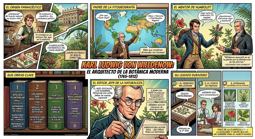 Es importante entender que en botánica, el «descubridor» no siempre es quien ve la planta por primera vez, sino quien escribe la descripción técnica en latín que la hace oficial. Willdenow fue el «editor jefe» de la naturaleza de su tiempo.