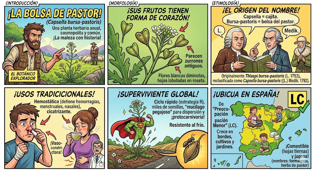 La Capsella bursa-pastoris, conocida comúnmente como bolsa de pastor, es una planta herbácea anual de la familia de las brasicáceas (Brassicaceae). Es una de las especies silvestres más comunes y extendidas por todo el mundo, considerada a menudo una maleza, pero con una historia fascinante en la botánica y la medicina tradicional.