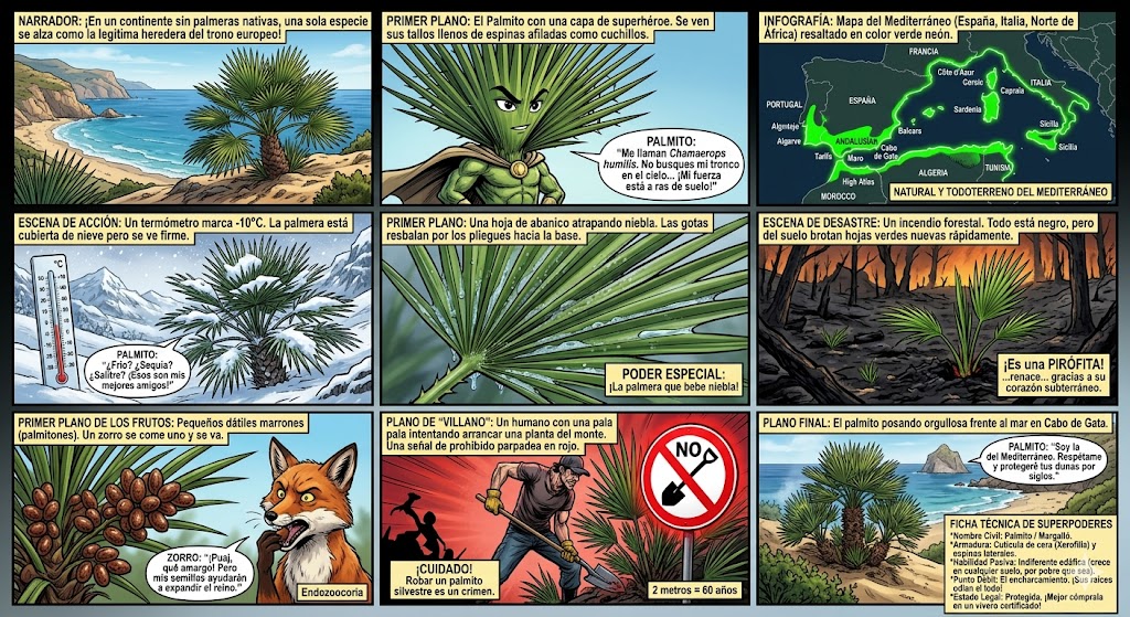 Adaptación: El palmito es extremadamente resistente. Soporta la salinidad del aire marino, la falta de agua y los suelos pobres y arenosos de la duna o el acantilado.