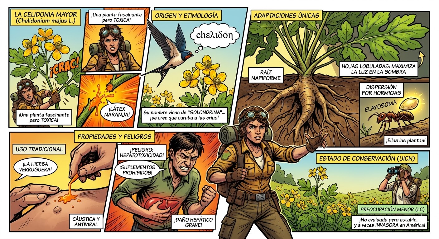 Las adaptaciones de Chelidonium majus L. son un ejemplo fascinante de especialización para sobrevivir en entornos alterados por el hombre (ruderales) y competir en zonas de semisombra. Su éxito evolutivo se basa en estrategias químicas, reproductivas y morfológicas muy precisas.