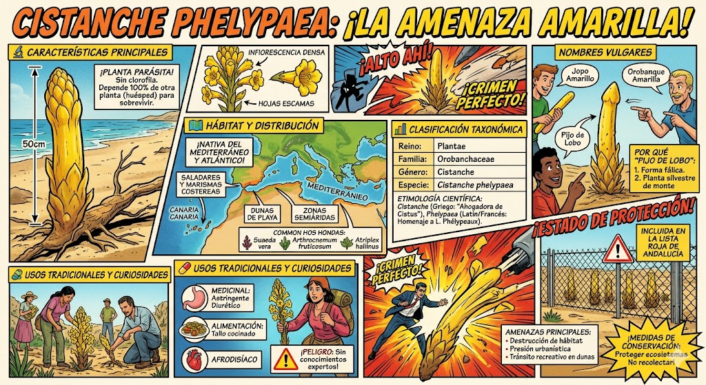 La Cistanche phelypaea (L.) Cout. es una planta fascinante y peculiar, conocida popularmente en español como jopo amarillo o pijo de lobo.