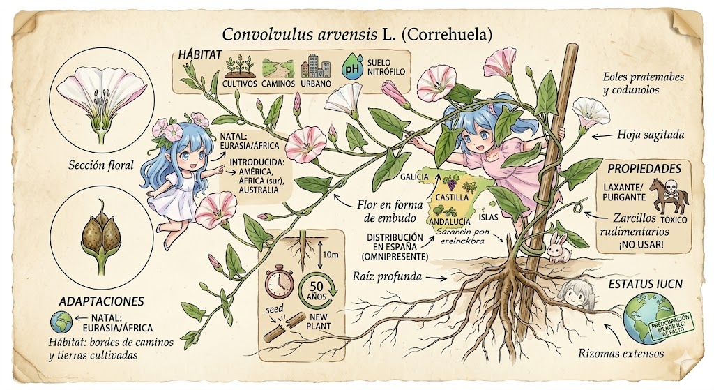 La Convolvulus arvensis L. es una de las plantas con mayor éxito evolutivo en entornos hostiles y agrícolas. Su supervivencia no es casualidad; posee una serie de adaptaciones biológicas y fisiológicas extraordinarias que la convierten en una «superviviente» nata.
