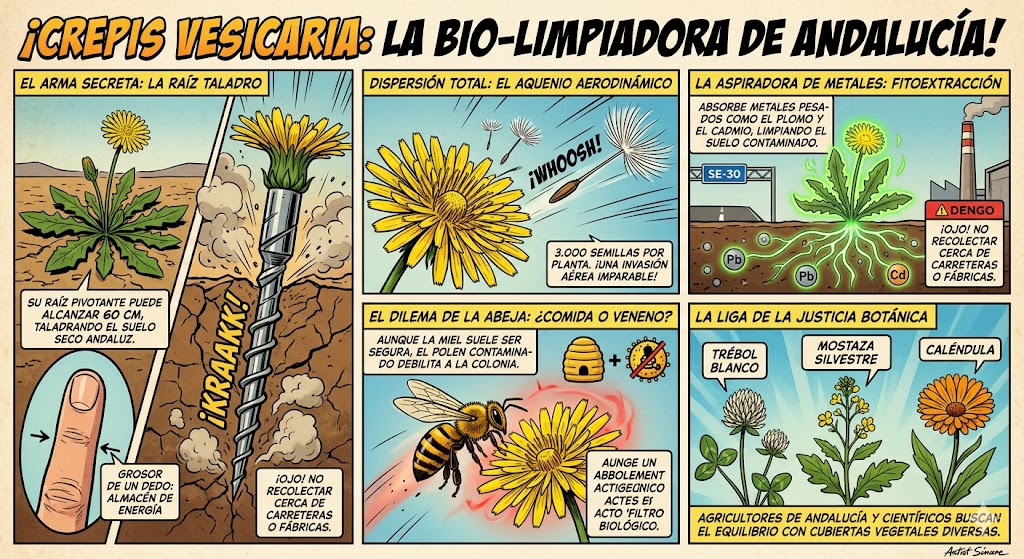 La relación entre la fitorremediación de la Crepis vesicaria subsp. taraxacifolia y la apicultura en Andalucía es un tema de investigación crítico, ya que nuestra región es una potencia apícola y esta planta es, literalmente, el primer «gran banquete» de la primavera para las abejas.