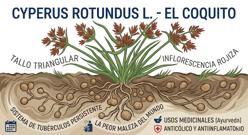 El Cyperus rotundus L., conocido comúnmente como coquito, juncia real o falso cebollín, es una planta herbácea perenne de la familia de las ciperáceas. Es famosa en el mundo de la agricultura y la botánica por dos razones opuestas: es considerada una de las malezas más difíciles de erradicar, pero también posee un largo historial de usos medicinales.
