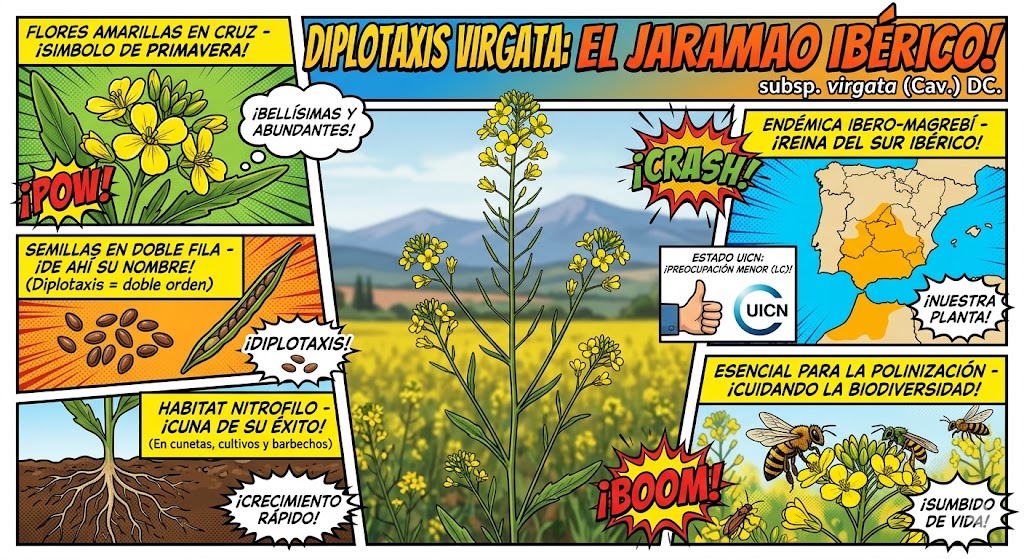 A diferencia de otros endemismos que son raros o están en peligro porque viven en una sola montaña o cueva, Diplotaxis virgata subsp. virgata es un endemismo expansivo. Ha aprovechado la modificación del paisaje por el ser humano para extenderse por casi toda la mitad sur de la península, convirtiéndose en una de las plantas más abundantes de nuestro entorno a pesar de tener un área de distribución global restringida.
