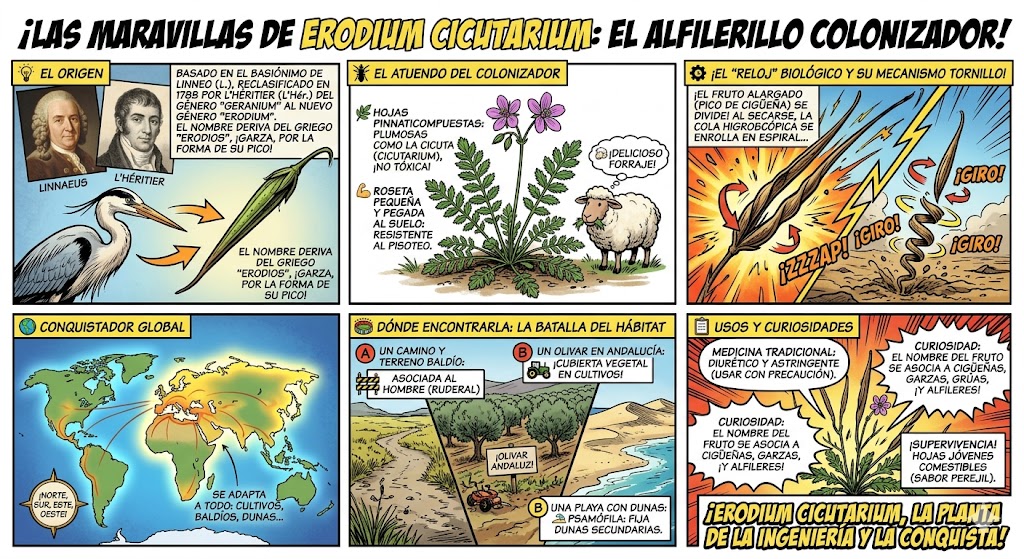 La especie Erodium cicutarium, comúnmente conocida como alfilerillo de pastor, es una planta herbácea de la familia Geraniaceae. Es famosa por su increíble capacidad de dispersión y su presencia en casi todo el mundo, siendo considerada a menudo una «colonizadora experta».