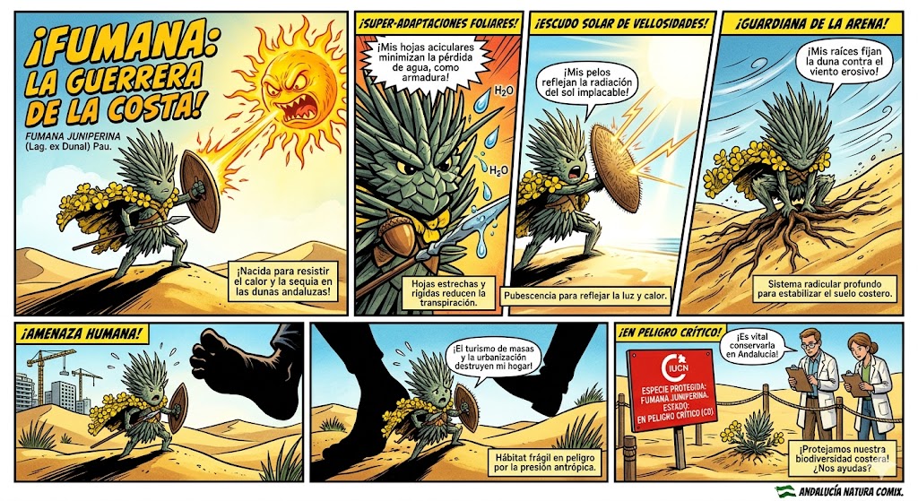 En resumen: La Fumana juniperina no intenta luchar contra el sol y la sequía, sino que se «encoge» y se «protege» para pasar desapercibida ante ellos, convirtiéndose en una pieza clave para fijar el suelo en ecosistemas tan frágiles como las playas andaluzas.