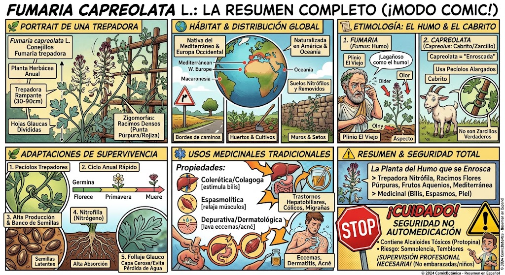 La etimología de Fumaria capreolata es muy interesante, ya que combina la tradición clásica europea con la descripción física de la planta.