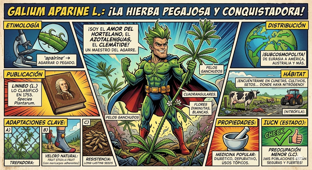 La etimología del nombre científico Galium aparine L. es fascinante porque describe perfectamente las características físicas y los usos históricos de la planta.