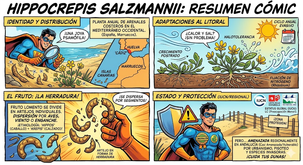 La Hippocrepis salzmannii es una superviviente nata de los entornos más hostiles del litoral andaluz y magrebí. Para prosperar en arenas móviles, bajo un sol abrasador y con niveles altos de salinidad, ha desarrollado una serie de «estrategias de ingeniería» biológica: