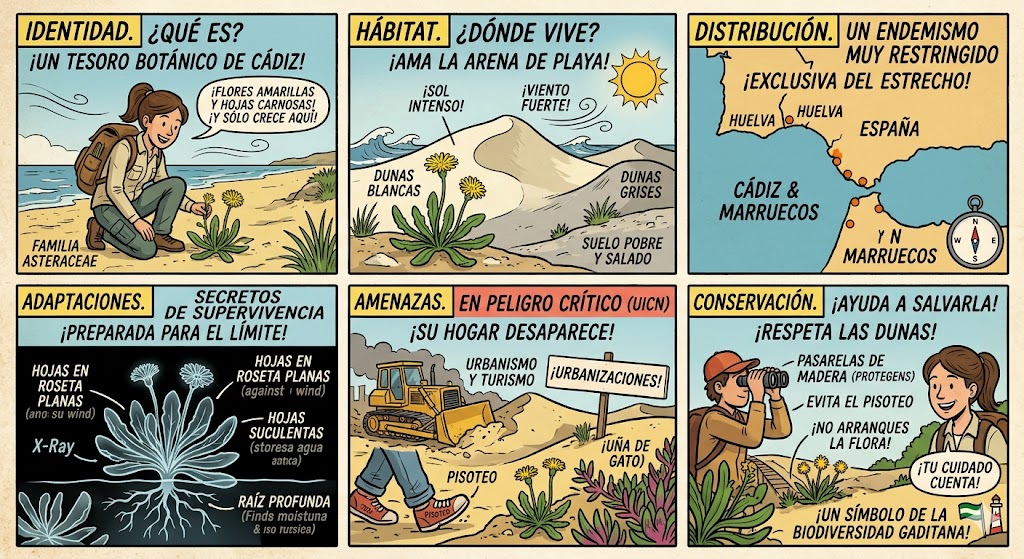 Dato curioso de localización: En Andalucía, a menudo se la encuentra junto a otra planta protegida y muy similar en apariencia pero de mayor tamaño, el Taraxacum gaditanum (diente de león de Cádiz), compartiendo los mismos arenales.