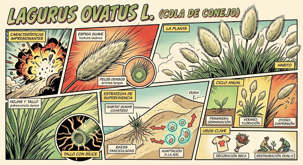Nota de campo: Si caminas por un sistema dunar en mayo, verás que el Lagurus ovatus suele convivir con especies como la Ammophila arenaria (Barrón) o el Pancratium maritimum (Nardo marítimo), formando un paisaje visualmente muy suave pero ecológicamente muy resistente.