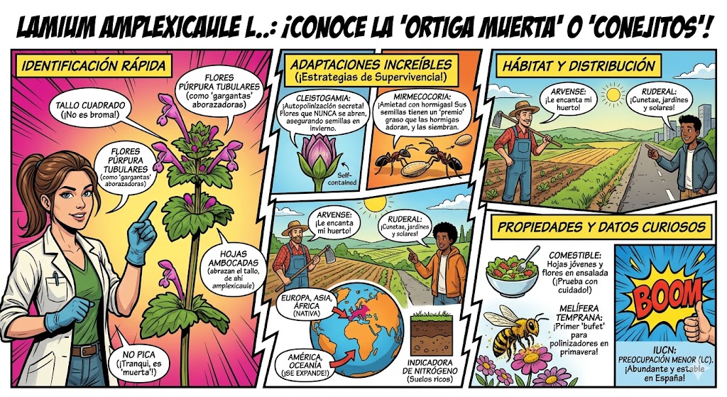 La Lamium amplexicaule L. es una superviviente nata. Su éxito global no es casualidad, sino el resultado de una serie de adaptaciones evolutivas estratégicas que le permiten prosperar donde otras plantas fallan.
