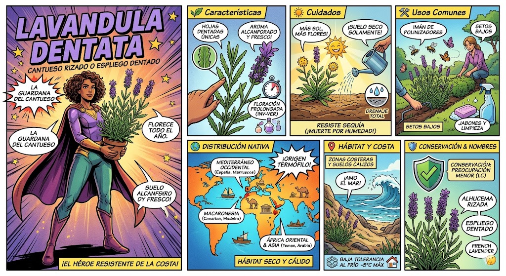 Dato curioso: A diferencia de otras lavandas que prefieren el frío para florecer, la Lavandula dentata es más sensible a las heladas fuertes. Si vives en una zona donde la temperatura baja de los -5°C, es mejor tenerla resguardada o en maceta.