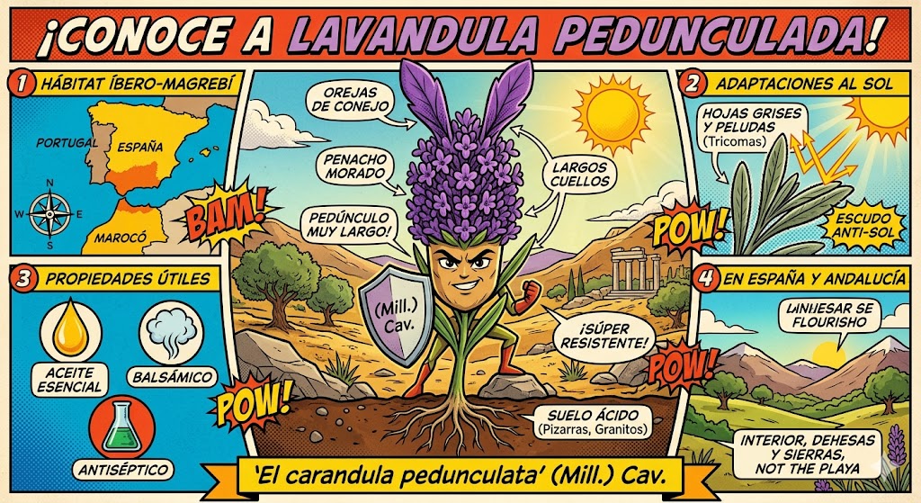 Si estás en una zona de España o Portugal con suelos de pizarra o granito, en una ladera soleada y abierta, lo más probable es que la Lavandula pedunculata sea la planta que domine el paisaje con sus característicos penachos morados.
