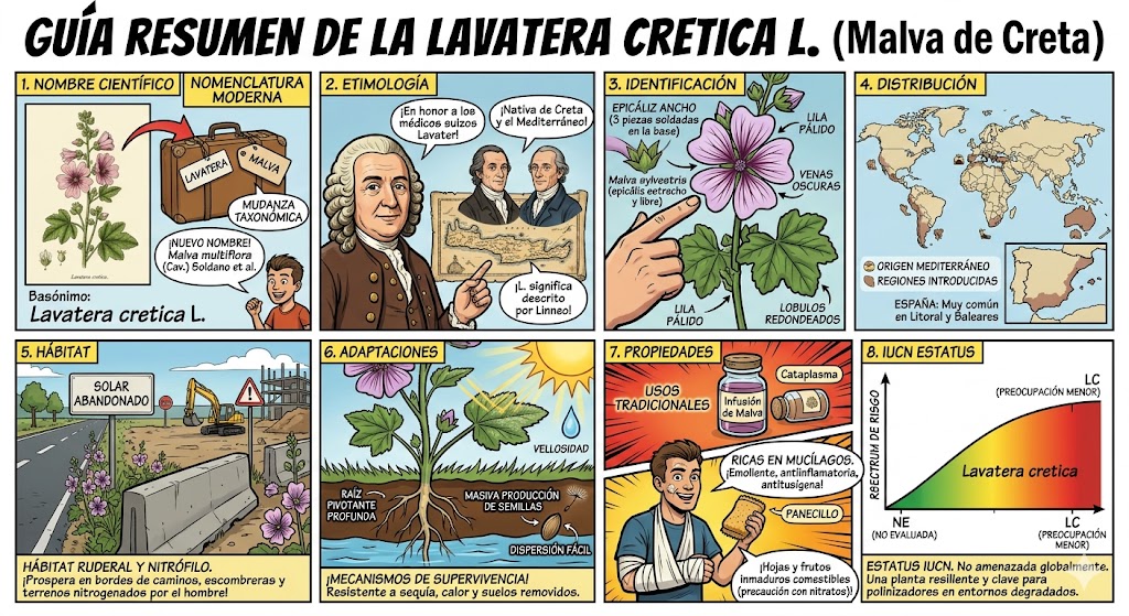 La etimología del nombre científico Lavatera cretica L. es fascinante porque combina un homenaje a la historia de la ciencia con una referencia geográfica directa.