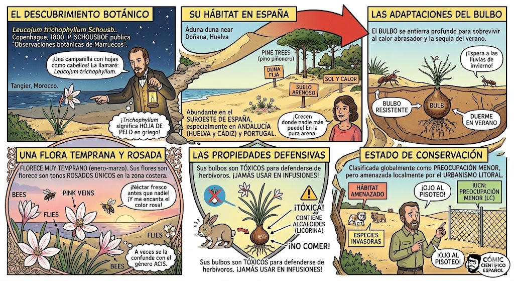 Imagina un claro de sol en un pinar cerca de la costa de Huelva o Cádiz, con un suelo de arena blanca y fina, rodeada de jaras y tomillos. Ese es el lugar perfecto donde la Leucojum trichophyllum florece masivamente al final del invierno.