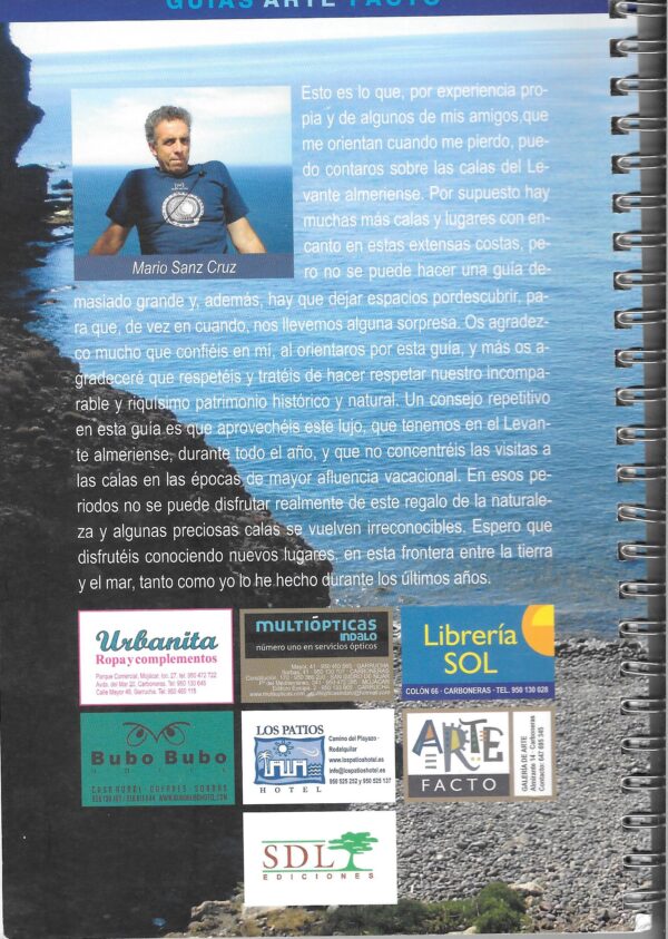 Os agradezco mucho que confiéis en mí, al orientaros por esta guía, y más os agradeceré que respetéis y tratéis de hacer respetar nuestro incomparable y riquísimo patrimonio histórico y natural. Un consejo repetitivo en esta guía es que aprovechéis este lujo, que tenemos en el Levante almeriense, durante todo el año, y que no concentréis las visitas a las calas en las épocas de mayor afluencia vacacional. En esos periodos no se puede disfrutar realmente de este regalo de la naturaleza y algunas preciosas calas se vuelven irreconocibles. Espero que disfrutéis conociendo nuevos lugares, en esta frontera entre la tierra y el mar, tanto como yo lo he hecho durante los últimos años.»