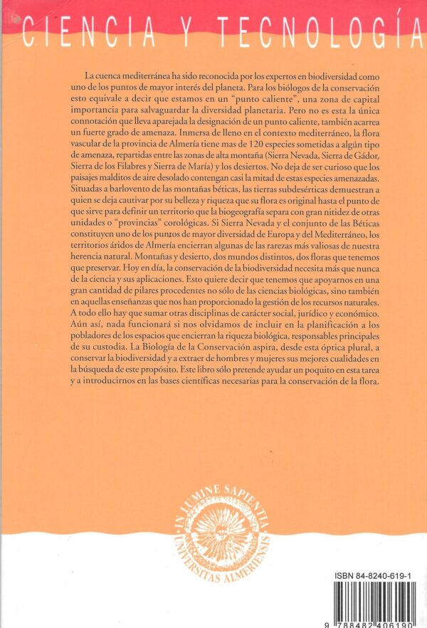 El contenido de la primera obra, «Flora amenazada de la provincia de Almería», según el texto de la contraportada de la imagen que has subido, se resume en los siguientes puntos: