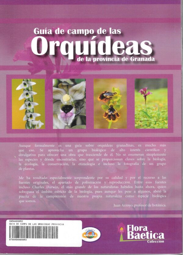 Texto descriptivo: «Aunque formalmente es una guía sobre orquídeas granadinas, es mucho más que eso. Se aprovecha un grupo biológico de alto interés científico y divulgativo para ofrecer una obra que trasciende de él. No se enumeran simplemente las especies y dónde encontrarlas, sino que se proporcionan claves sobre la biología, la ecología, la conservación, la etimología e incluso la fotografía de un grupo de plantas.