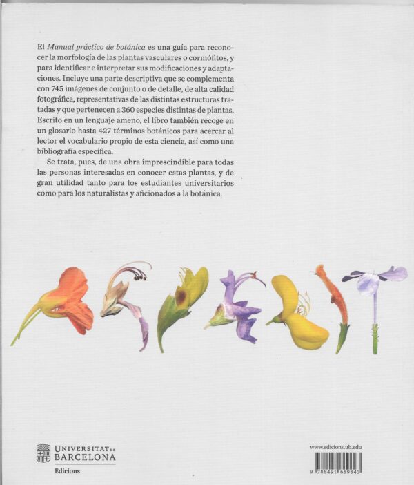 El Manual práctico de botánica es una guía para reconocer la morfología de las plantas vasculares o cormófitos, y para identificar e interpretar sus modificaciones y adaptaciones. Incluye una parte descriptiva que se complementa con 745 imágenes de conjunto o de detalle, de alta calidad fotográfica, representativas de las distintas estructuras tratadas y que pertenecen a 360 especies distintas de plantas. Escrito en un lenguaje ameno, el libro también recoge en un glosario hasta 427 términos botánicos para acercar al lector el vocabulario propio de esta ciencia, así como una bibliografía específica.
