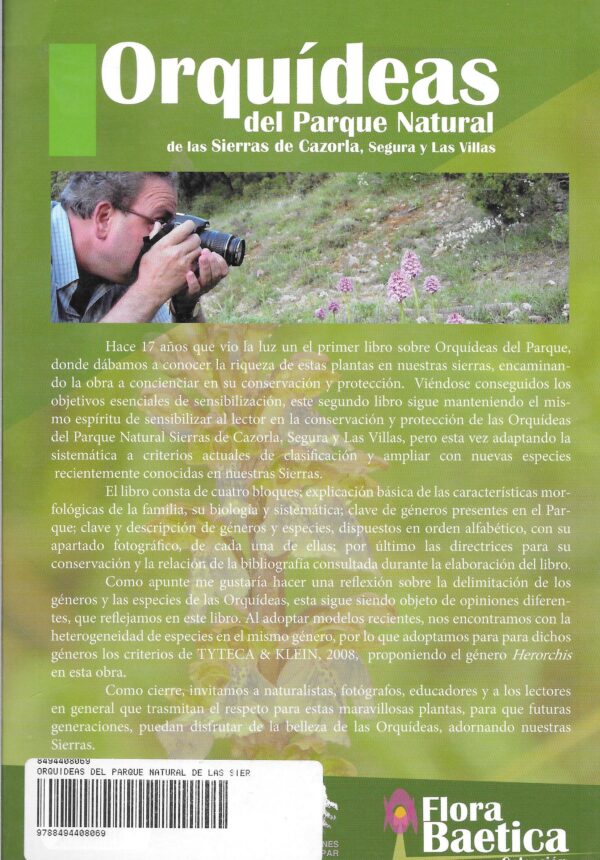 Hace 17 años que vio la luz un primer libro sobre Orquídeas del Parque, donde dábamos a conocer la riqueza de estas plantas en nuestras sierras, encaminando la obra a concienciar en su conservación y protección. Viéndose conseguidos los objetivos esenciales de sensibilización, este segundo libro sigue manteniendo el mismo espíritu de sensibilizar al lector en la conservación y protección de las Orquídeas del Parque Natural Sierras de Cazorla, Segura y Las Villas, pero esta vez adaptando la sistemática a criterios actuales de clasificación y ampliar con nuevas especies recientemente conocidas en nuestras Sierras.