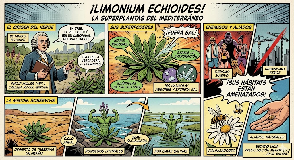 Conclusión: Si encuentras Limonium echioides en el campo, estás ante una sobreviviente nata que, por ahora, mantiene poblaciones saludables gracias a su estrategia de vida anual y su capacidad para colonizar suelos donde otras plantas no pueden competir.