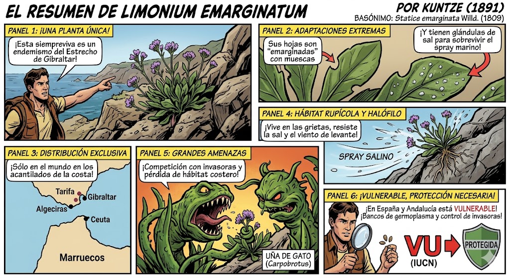 Para sobrevivir en uno de los entornos más hostiles del litoral andaluz (el Estrecho de Gibraltar), la Limonium emarginatum ha desarrollado una serie de adaptaciones evolutivas fascinantes. Al vivir en grietas de acantilados donde el agua dulce escasea y la salinidad es extrema, la planta funciona como una pequeña «máquina de ingeniería» biológica.