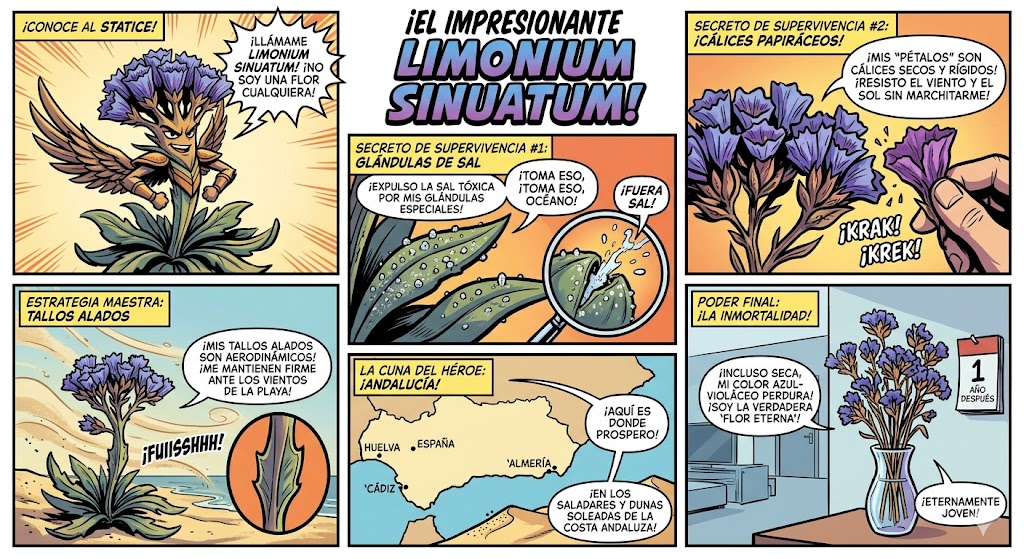 Para sobrevivir en los entornos hostiles de las costas andaluzas y el Mediterráneo, el Limonium sinuatum ha desarrollado un conjunto de adaptaciones morfológicas y fisiológicas que la convierten en una «superviviente» del reino vegetal.