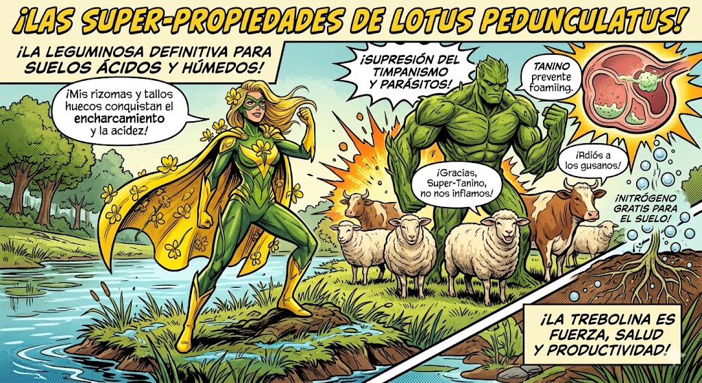 • Efecto Antitimpanizante: A diferencia de la alfalfa, el Lotus pedunculatus no produce meteorismo (hinchazón) en los rumiantes. Los taninos rompen la espuma de las proteínas en el rumen, evitando que el animal se asfixie por gases.