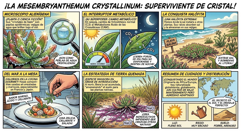 Esta planta pertenece a la familia Aizoaceae y es famosa por sus papilas epidérmicas (células de vejiga), que almacenan agua y brillan bajo el sol como si fueran cristales de hielo.
