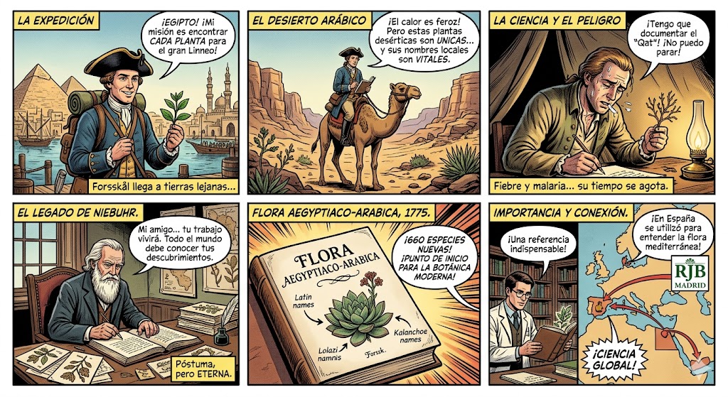 Aunque Peter Forsskål nunca visitó España y su obra se centra en Oriente Próximo, la «Flora Aegyptiaco-Arabica» tiene una conexión histórica y científica fascinante con el ámbito español a través de tres vías principales: