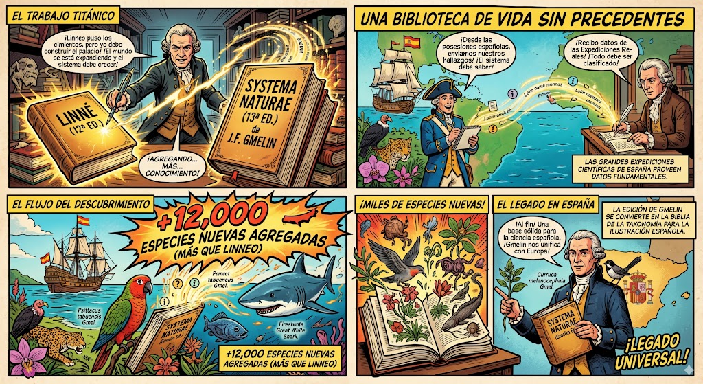 Aunque Gmelin era alemán y publicó en Leipzig, su obra fue el contenedor donde se vertieron indirectamente muchos de los descubrimientos de las Expediciones Reales Españolas. Los naturalistas españoles enviaban sus descripciones e ilustraciones a Europa central, y Gmelin las integraba en el sistema linneano, conectando así la biodiversidad del Imperio Español con el resto del mundo científico.