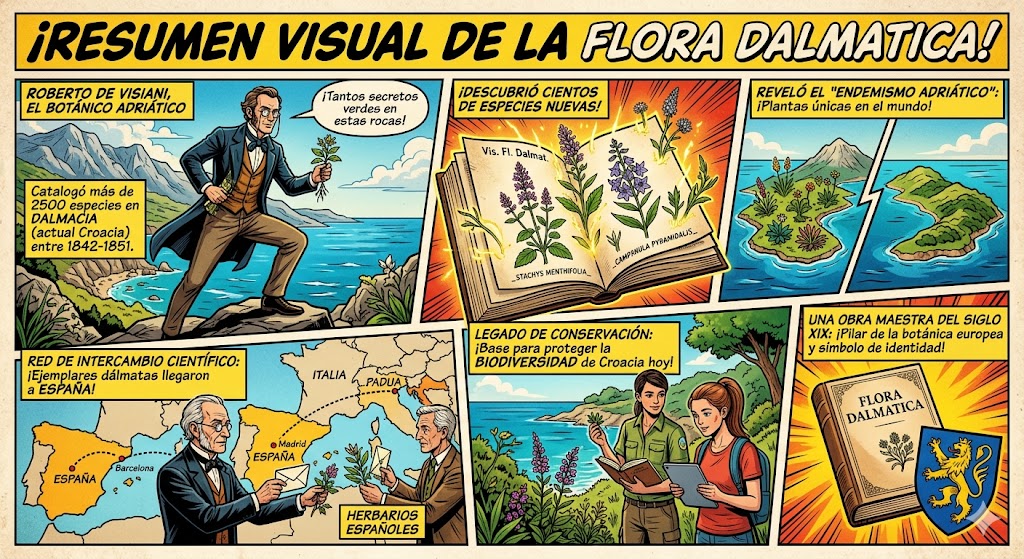 La relación de la «Flora Dalmatica» y de su autor, Roberto de Visiani, con España no es directa en términos de expediciones, pero sí es muy estrecha en el ámbito del intercambio científico europeo del siglo XIX y en la botánica comparada del Mediterráneo.