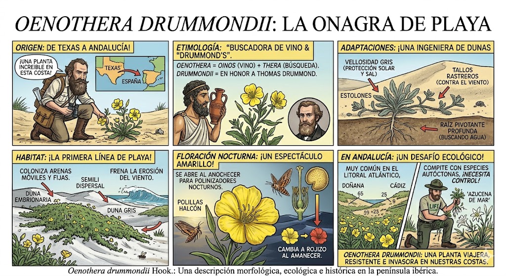 La etimología de Oenothera drummondii Hook. combina raíces del griego antiguo con un homenaje a uno de los coleccionistas botánicos más prolíficos del siglo XIX.